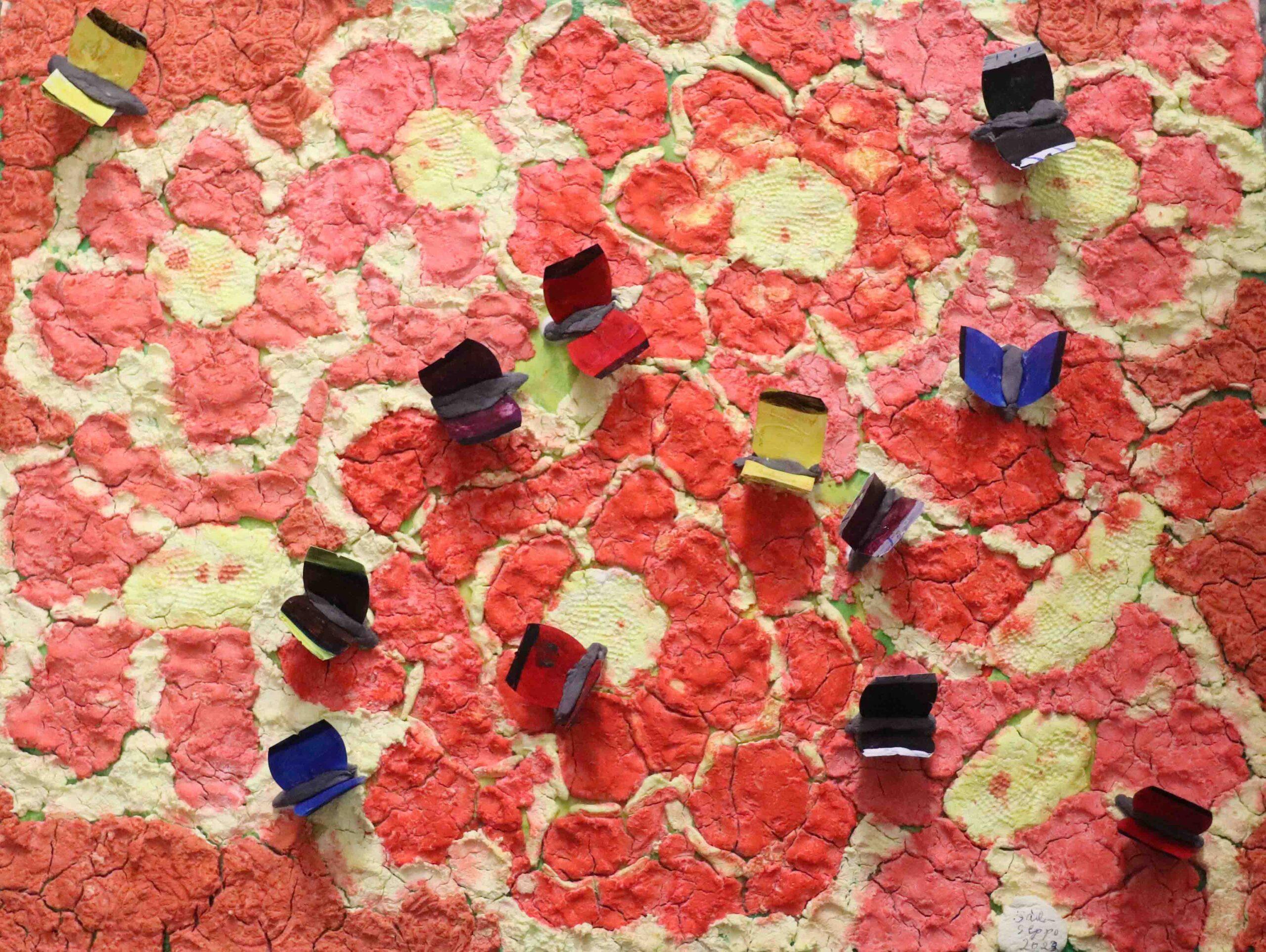 The spark for this painting came from flowers and transforming tea bag tags into butterflies.